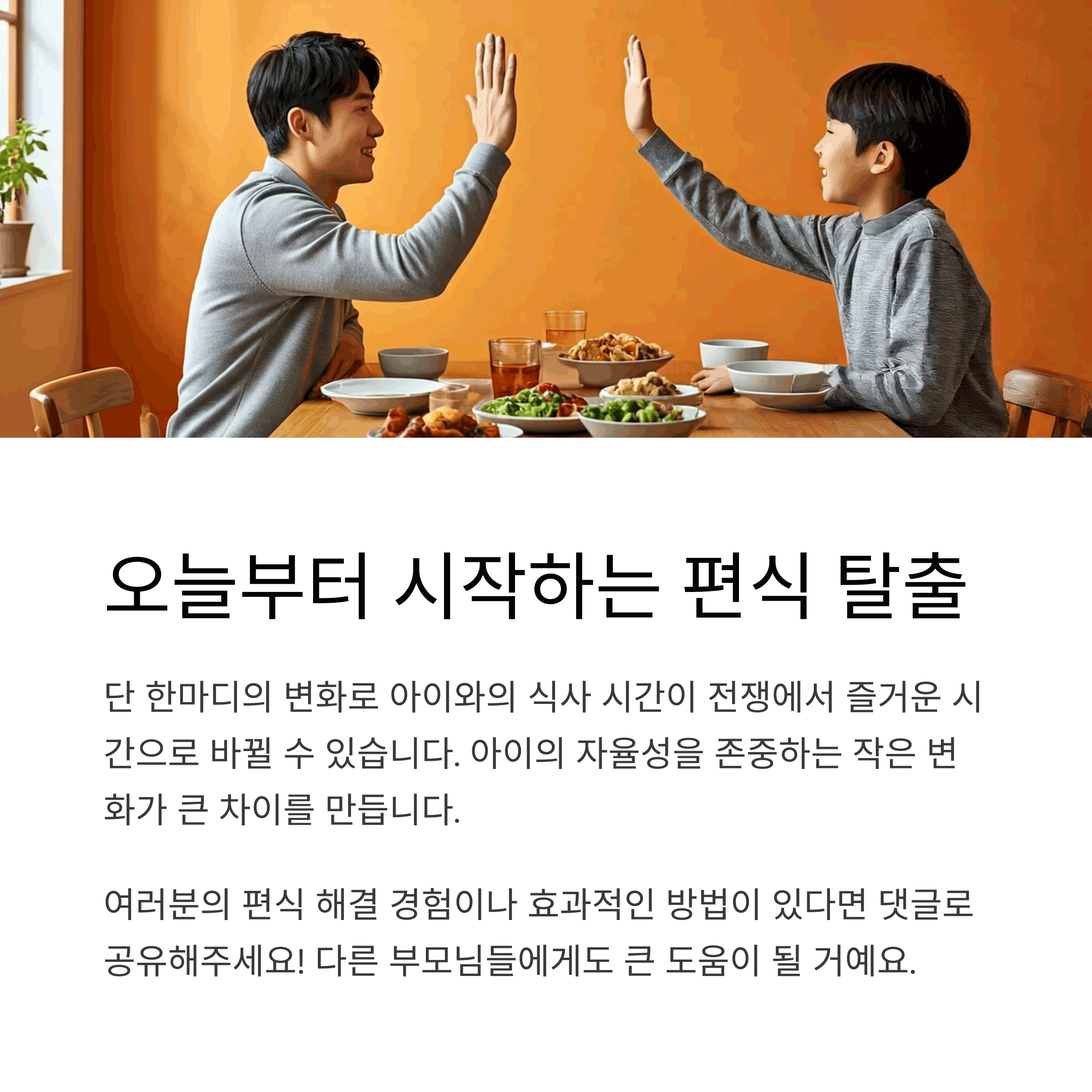 편식은 단순히 음식에 대한 거부를 넘어서 아이의 감정과 자존감을 반영하는 표현일 수 있습니다. 그래서 부모가 해야 할 일은 ‘음식을 먹이는 것’이 아니라 ‘식사를 통해 아이와 긍정적인 관계를 형성하는 것’입니다. 아이의 변화는 하루아침에 일어나지 않지만, 꾸준한 존중과 진심 어린 격려가 반복된다면 반드시 좋은 결과로 이어집니다. 오늘 소개한 한마디는 그러한 여정의 첫걸음이 되어줄 것입니다.