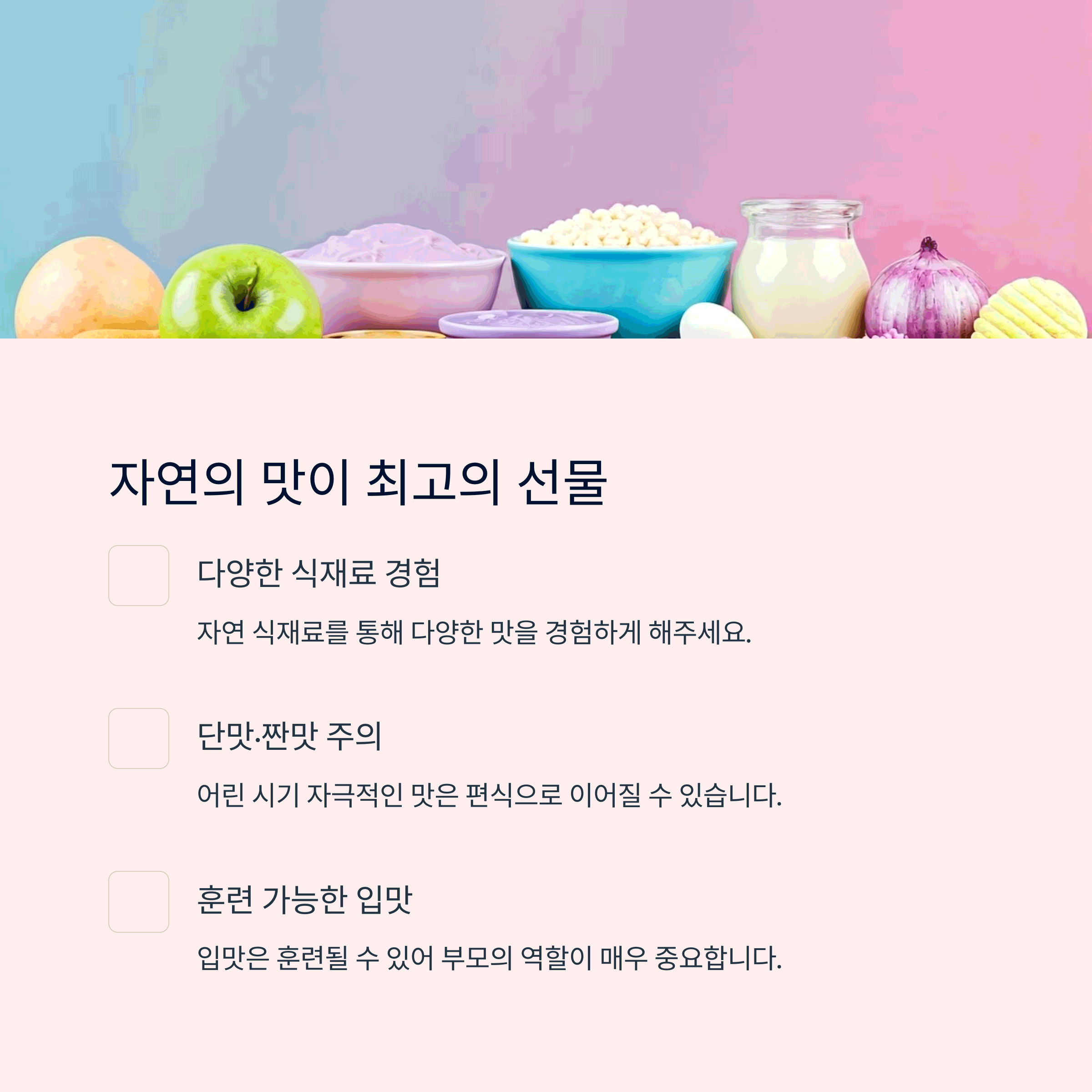 | 미각 발달 시기 | 자극적 음식 피하기 | 자연식 위주 식단 |