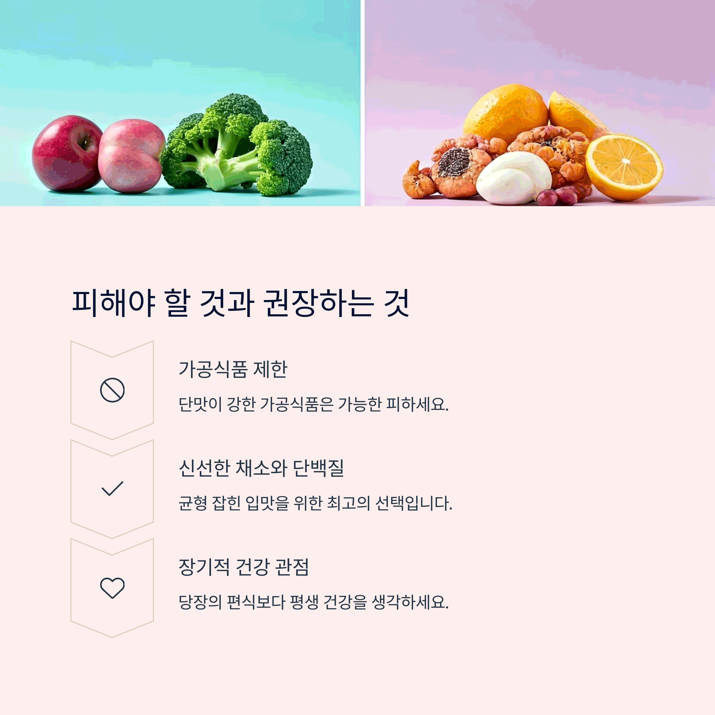 아이가 단맛이나 자극적인 음식을 자주 접하면 미각이 자극적인 맛에만 익숙해져 일반적인 식품을 거부하게 됩니다. 가공식품, 인스턴트 이유식, 과일즙 같은 당도가 높은 제품의 잦은 사용은 금물입니다. 단순히 먹이기 쉬운 음식을 고르는 것이 아니라 장기적인 식습관을 생각해 자연식 중심의 구성이 필요합니다.