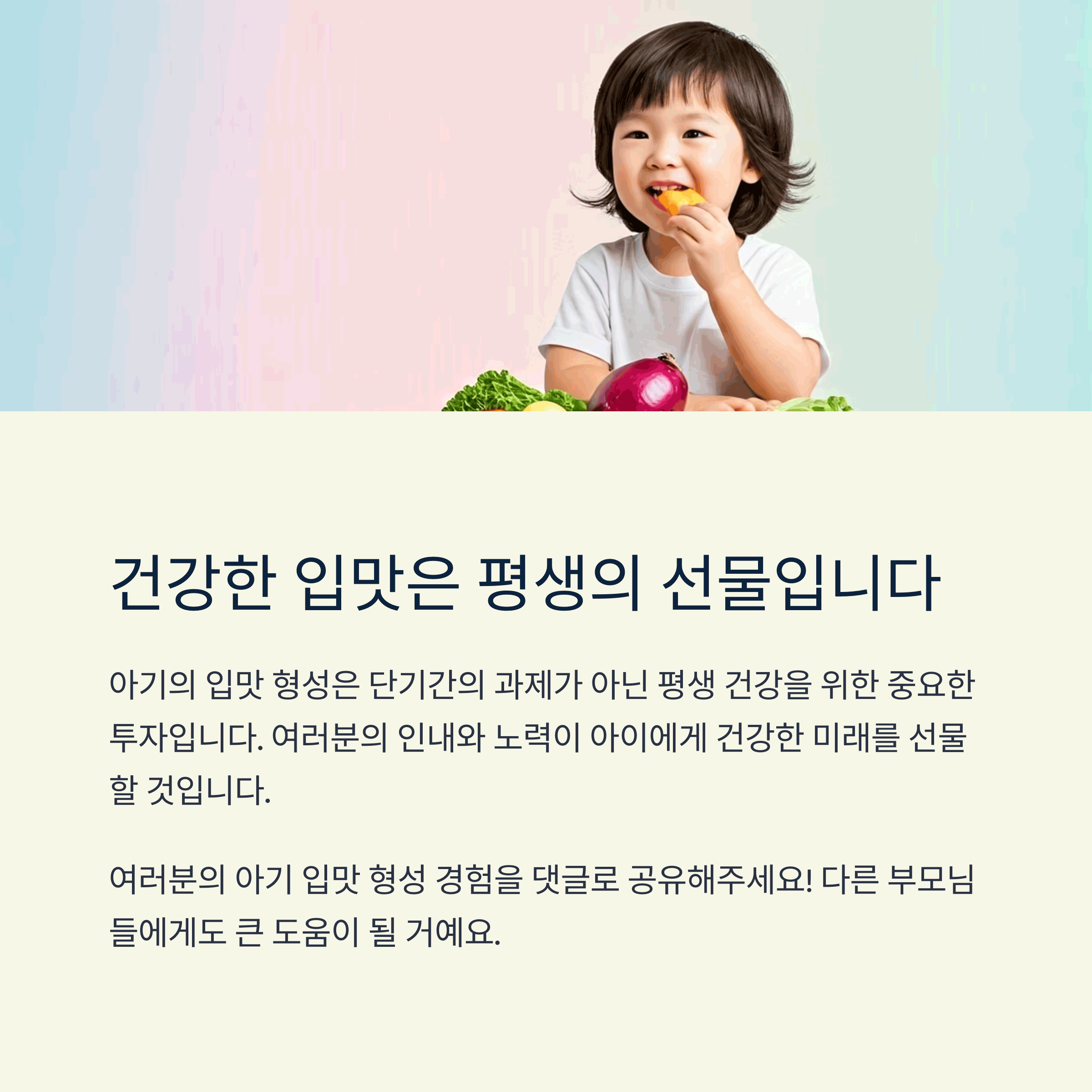 여러분은 아이의 입맛 형성에 어떤 방법을 사용하고 계신가요? 댓글로 다양한 경험과 팁을 공유해주시면 많은 부모님께 도움이 될 수 있습니다.