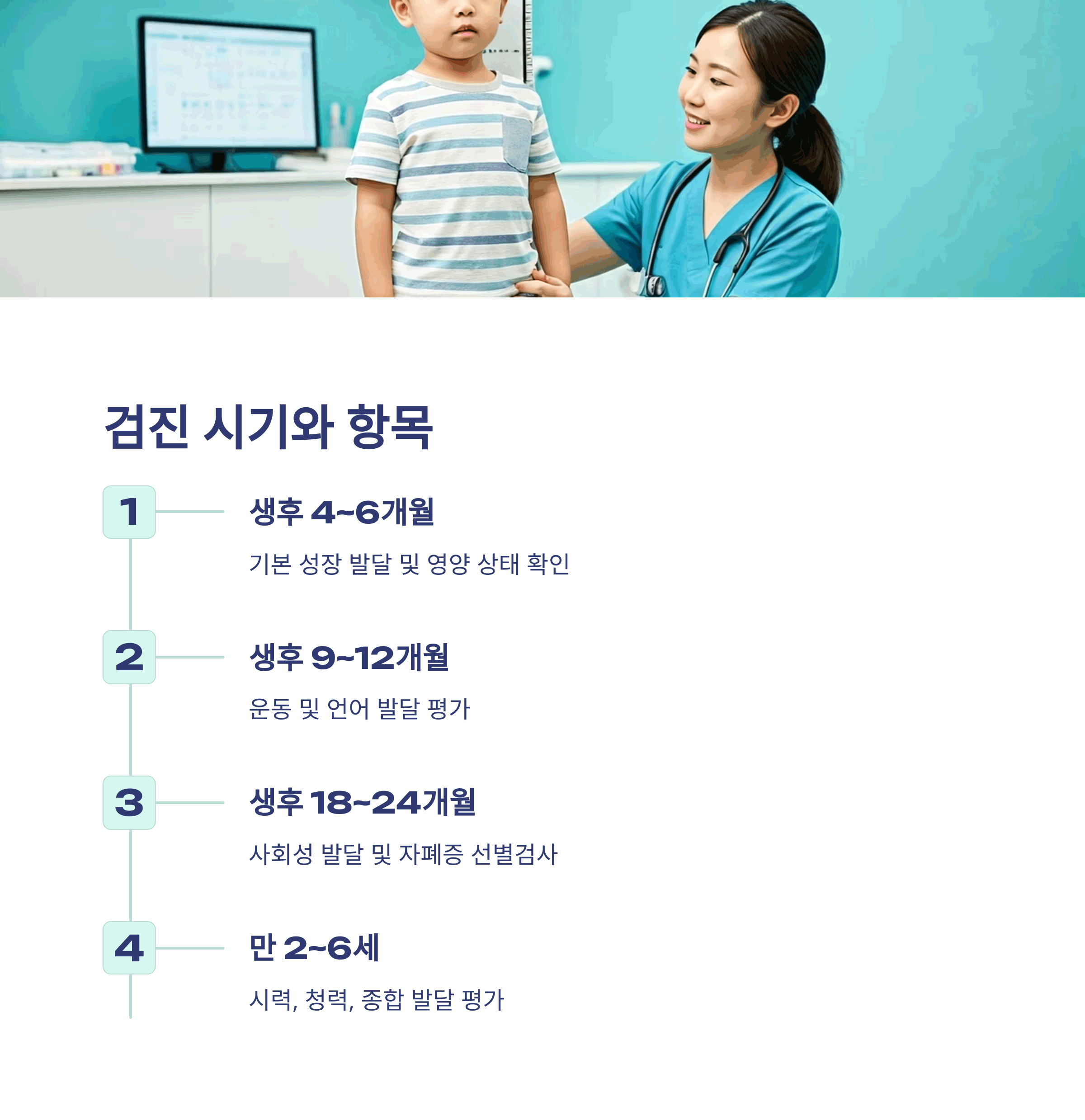| 영유아 검진 시기 | 총 7회, 생후 4개월부터 만 6세까지 단계별 실시 |