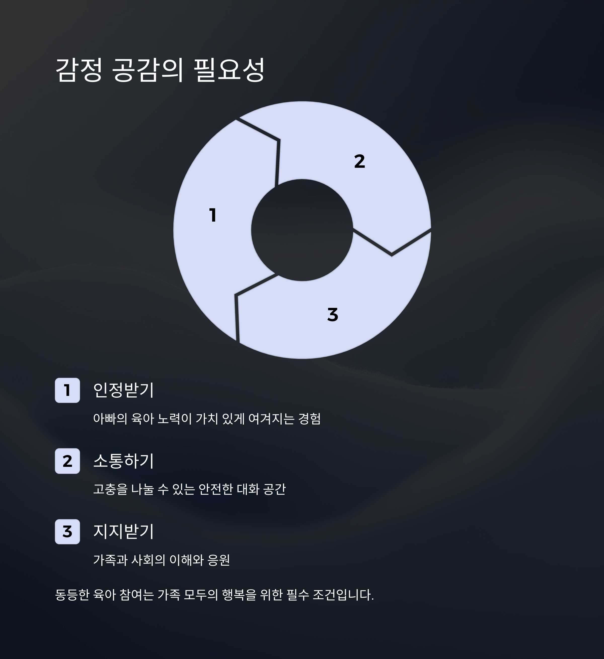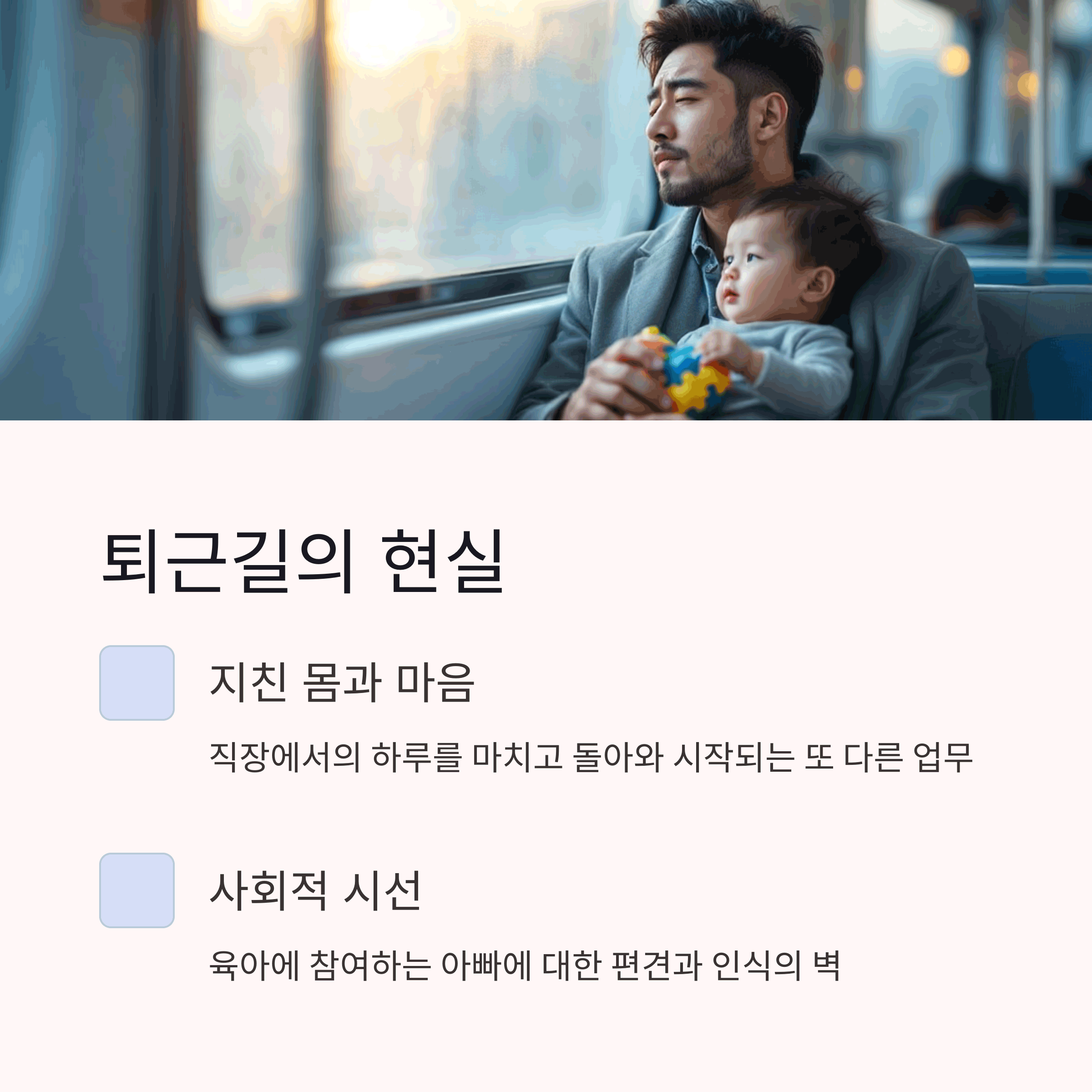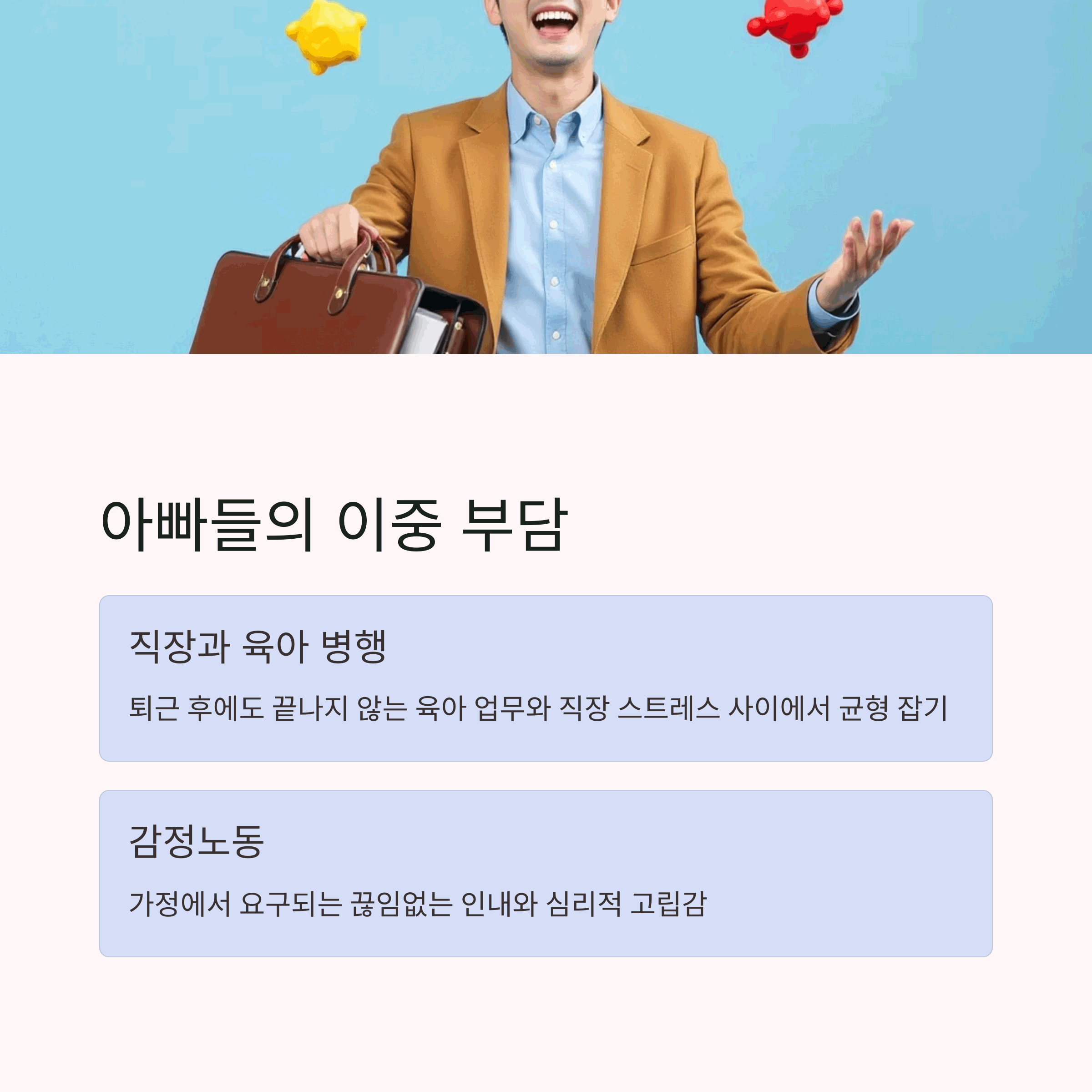 | 아빠도 감정을 표현할 수 있어야 합니다. | 육아는 감정노동, 인식 전환이 필요합니다. | 현실 공감 통해 개선의 시작을 만들 수 있습니다. |